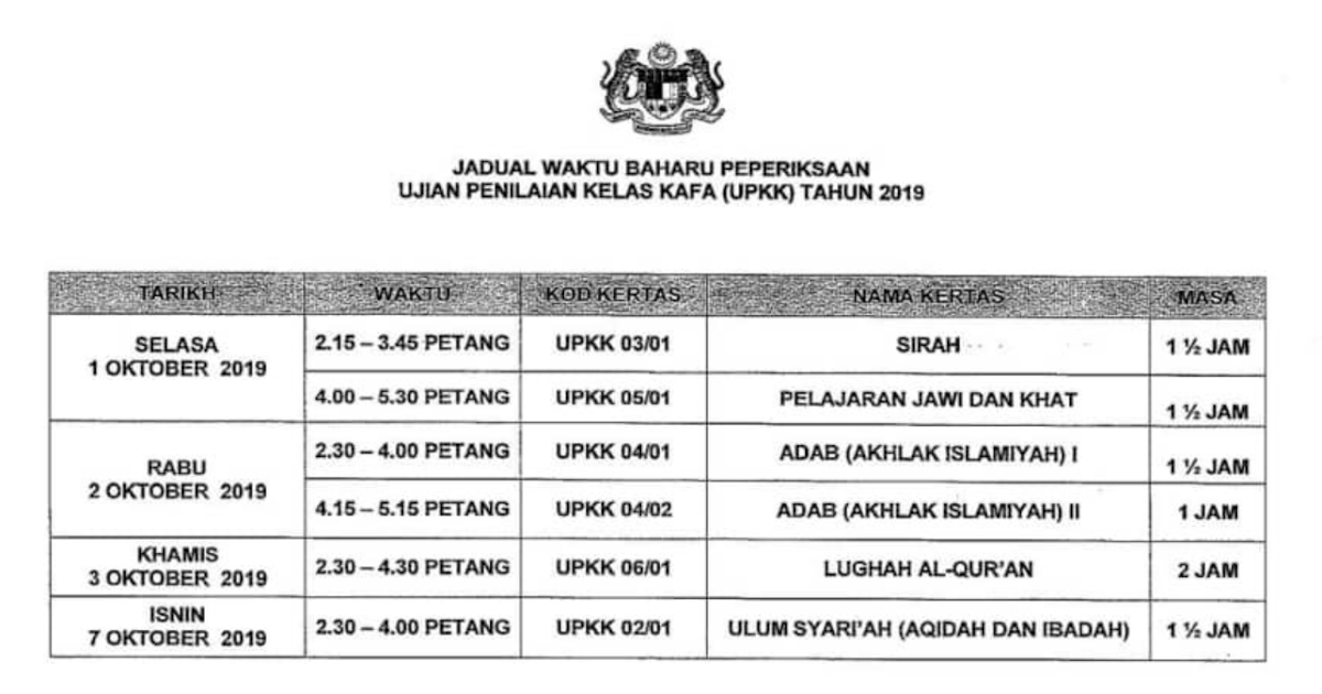 Jadual Waktu Peperiksaan Upkk 2020 Ujian Penilaian Kelas Kafa