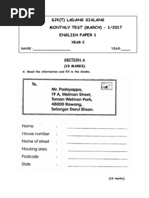 Sjk T Ladang Sialang Monthly Test March 1 2017 English Paper 1